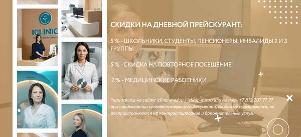 Скидки не суммируются с другими действующими скидками и акционными предложениями. На комплексные исследования, контрастное усилении и дополнительные услуги скидки не действуют. На ночной прейскурант скидки не распространяются.